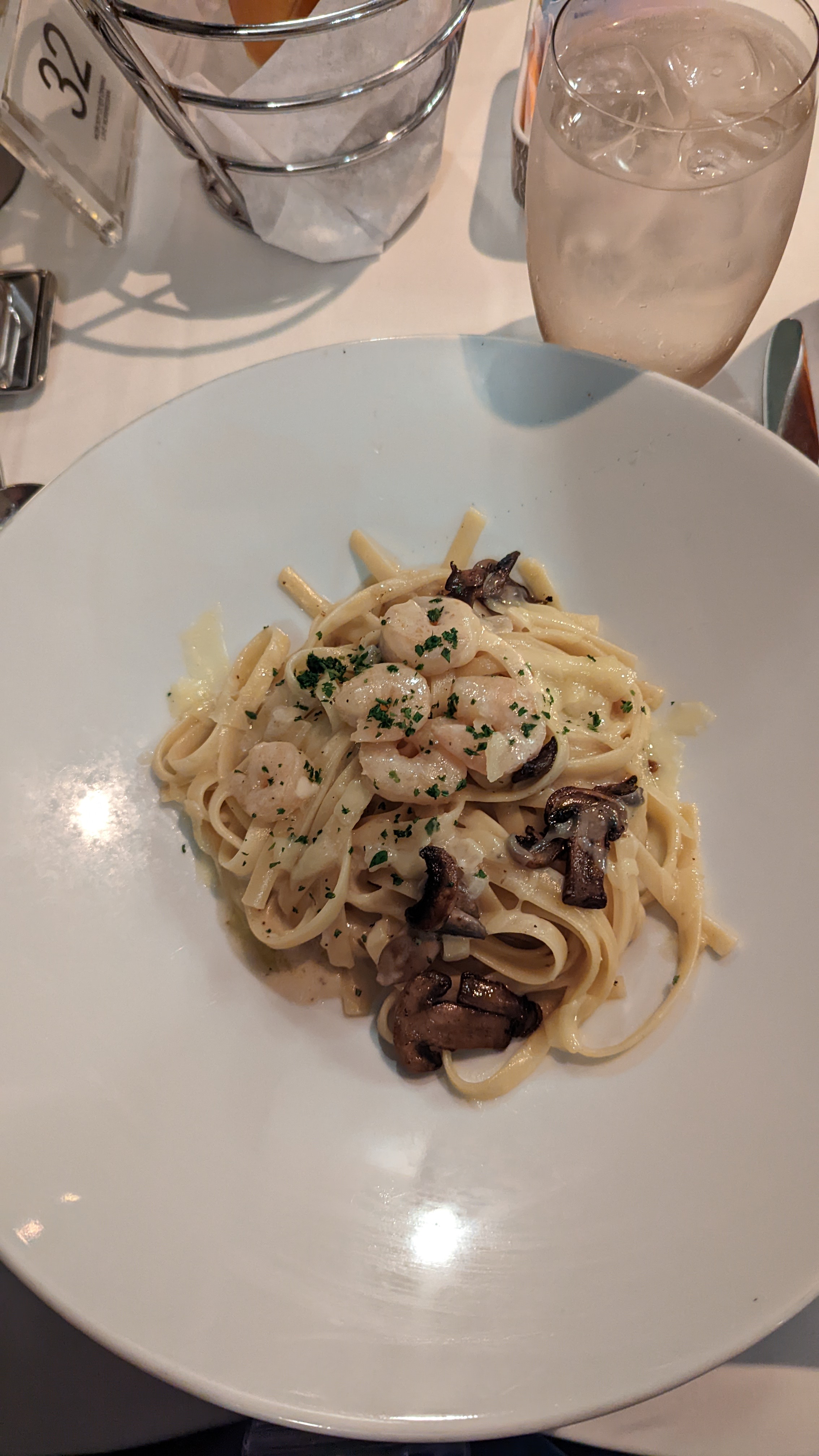 Roxan had shrip fettucini alfredo. It was a perfect portioon size, but she wasn’t able to complete it because she’d been peicing all day.