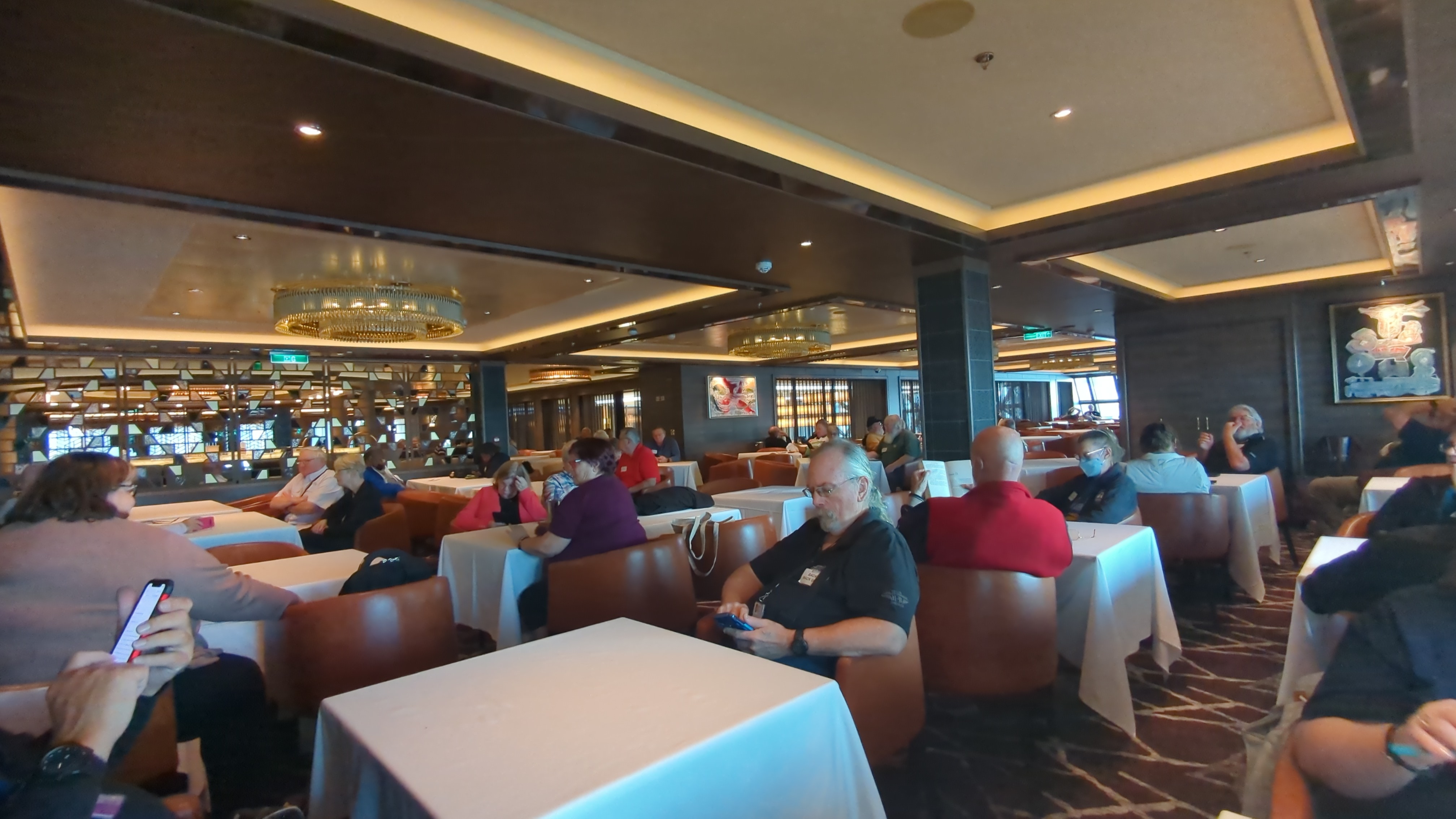 Of course one part of this needs to resemble onshore security theater… We’re visually corralled off from the rest of the restaurant and now just have rows of seats, no tables.