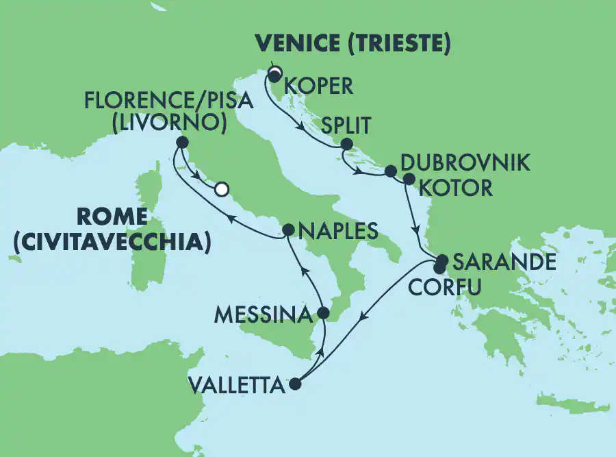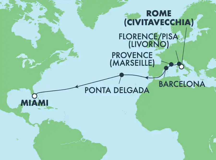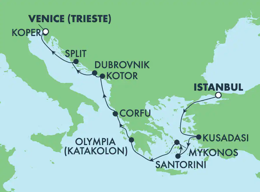 - Getaway, 3 legs: The itinerary we chose. Leg 1: Istanbul, Greece, Adriatic countries ending near Venice. Leg 2: Venice to Rome, several Adriatic stops and several western Italy stops. Leg 3: Rome to Miami with a stop each in France, Spain, and the Azores. We could have stretched it out one more leg, but again that meant a train ride from Miami to New Orleans. So three legs it is.