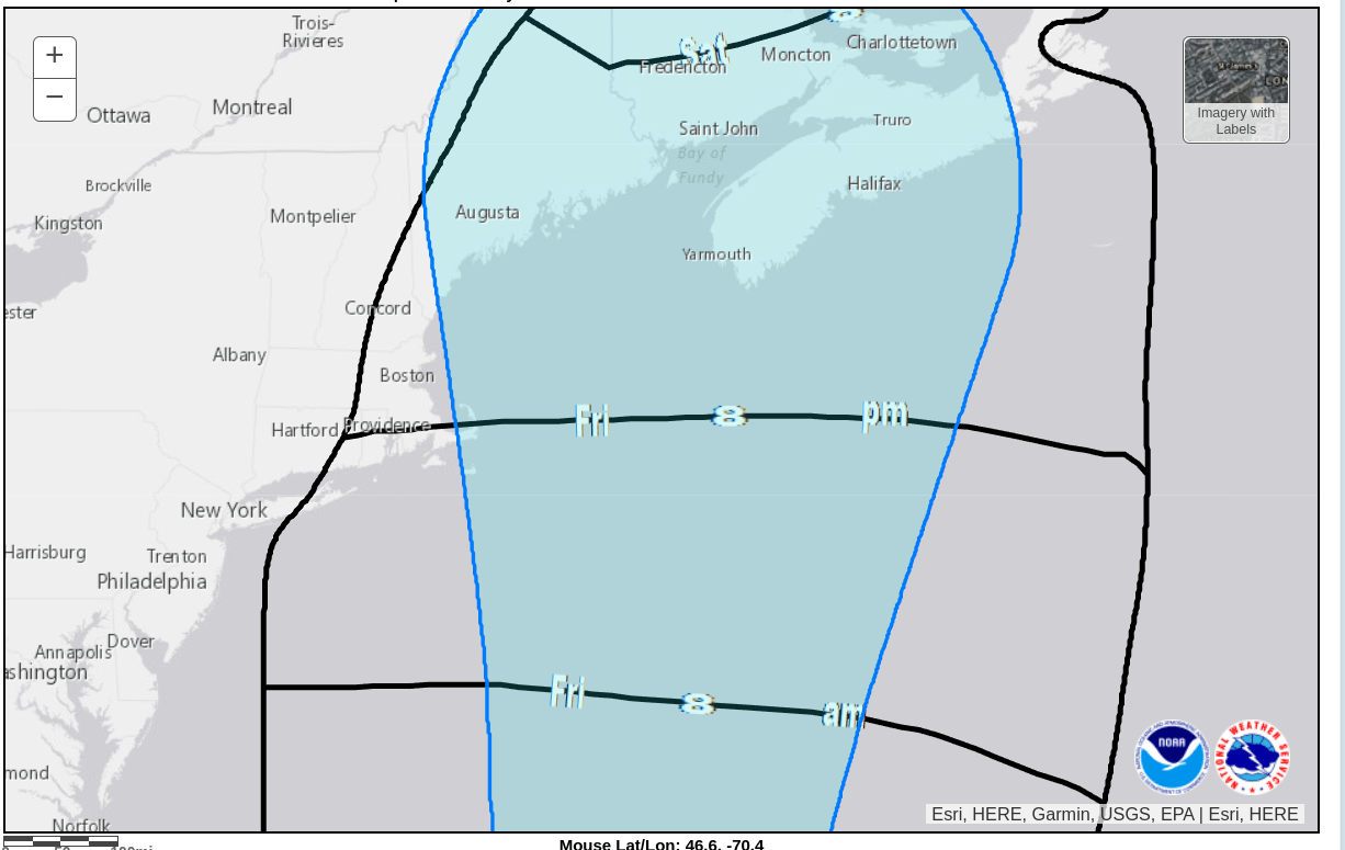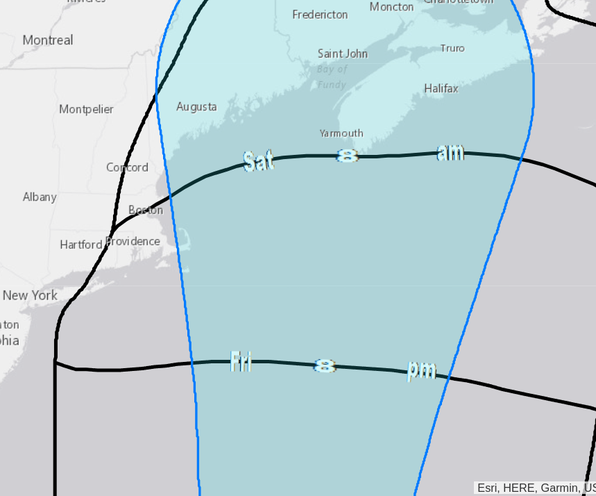 Still risky, IMO, but less so. I think it ultimately doesn’t matter what they do before Thursday, but if they do make the St. John stop passengers may have a difficult night Friday into Saturday. Sailing time from St John to Boston at 23 knots is about 13-14 hours. So it’s doable, if Escape can maintain that speed for that long. At a more normal 16 knots, the time is closer to 19 hours, putting the ship rounding Cape Cod around sunset Friday. That would have them sailing through TS-force wind for a few hours overnight, if you average the earliest reasonable and most-likely lines. So long as maintaining 20+ knots is doable given the sea conditions and current mechanical condition of the ship, I’d say things are okay through Thursday.