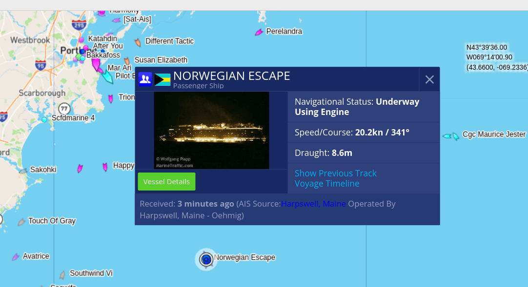 Cruising Earth shows the ship position as I write this about 25 statute miles off the coast of Portland, Maine. It appears they are running behind schedule according to Vessel Finder. Map image from Cruising Earth: