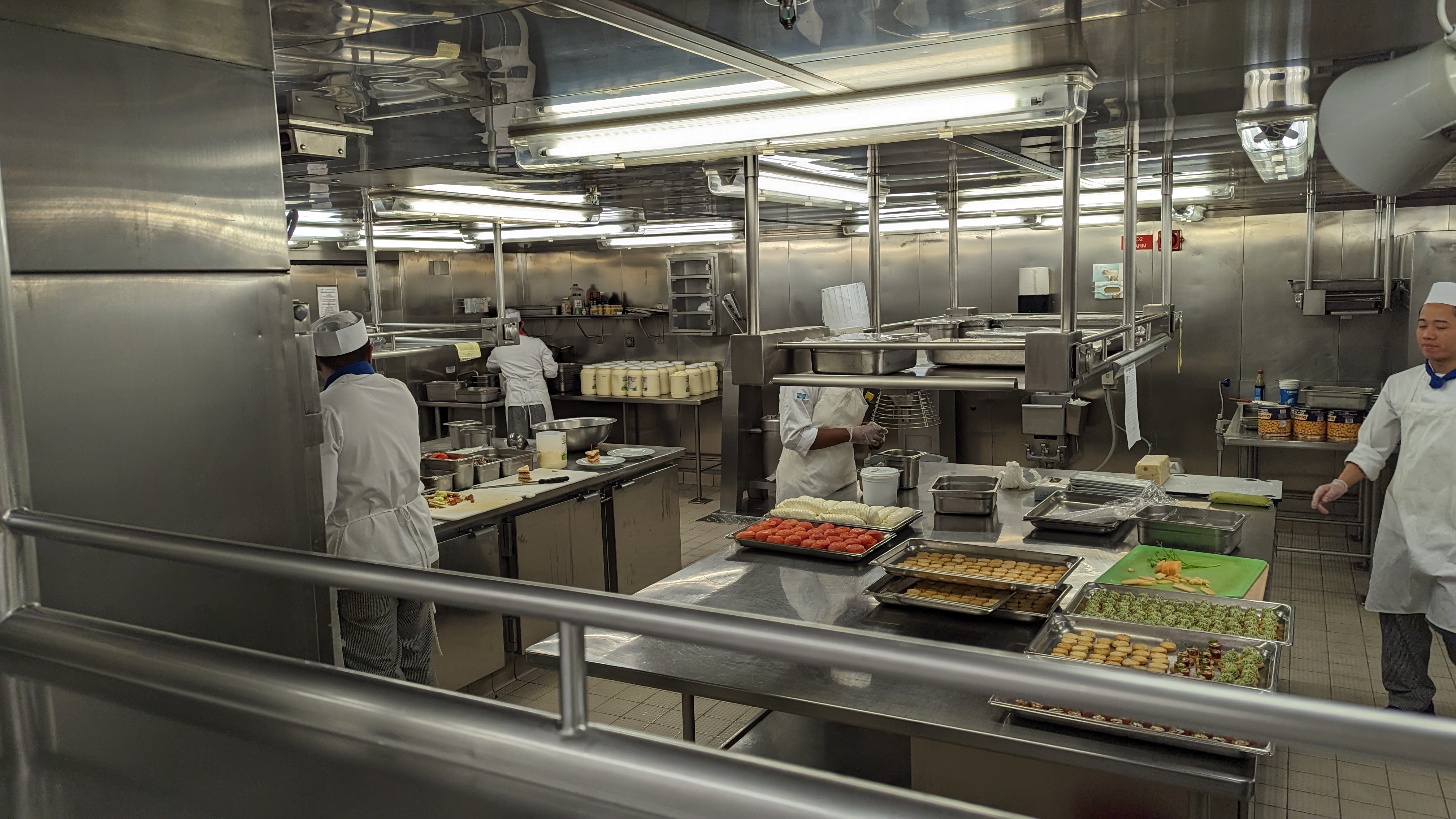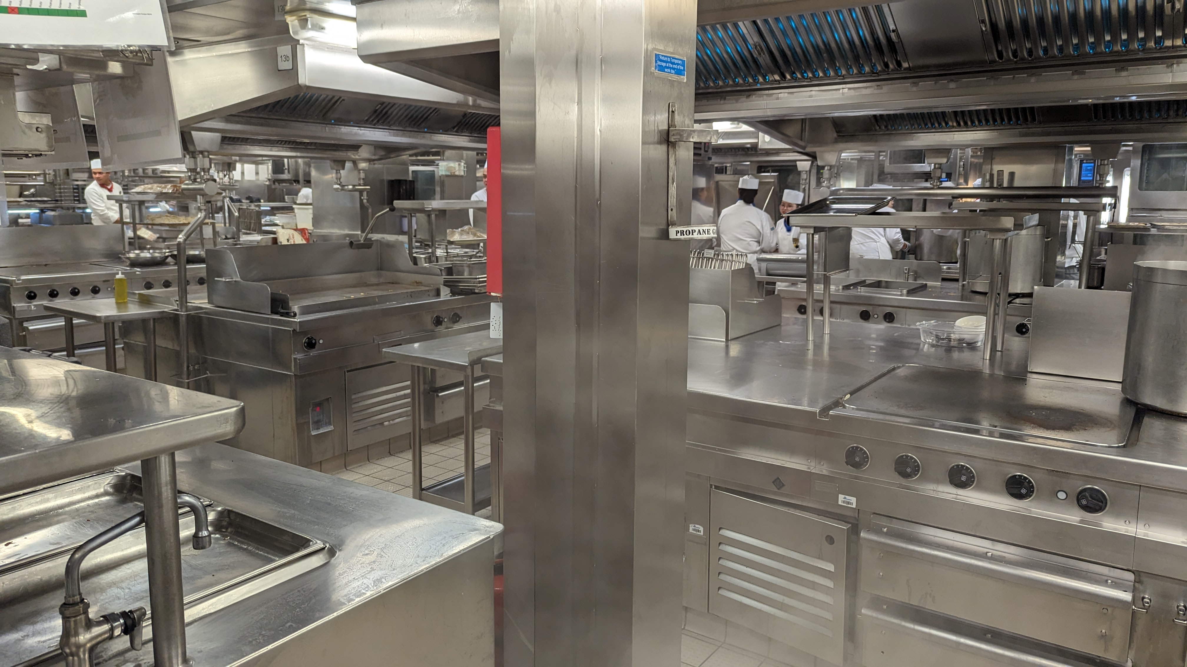 We didn’t get to take the escalator from Savor into the kitchen galley, but we did have to dodge the bussers readying dirty tablecloths for the quick trip down five decks to the laundry (but again, I get ahead of myself).