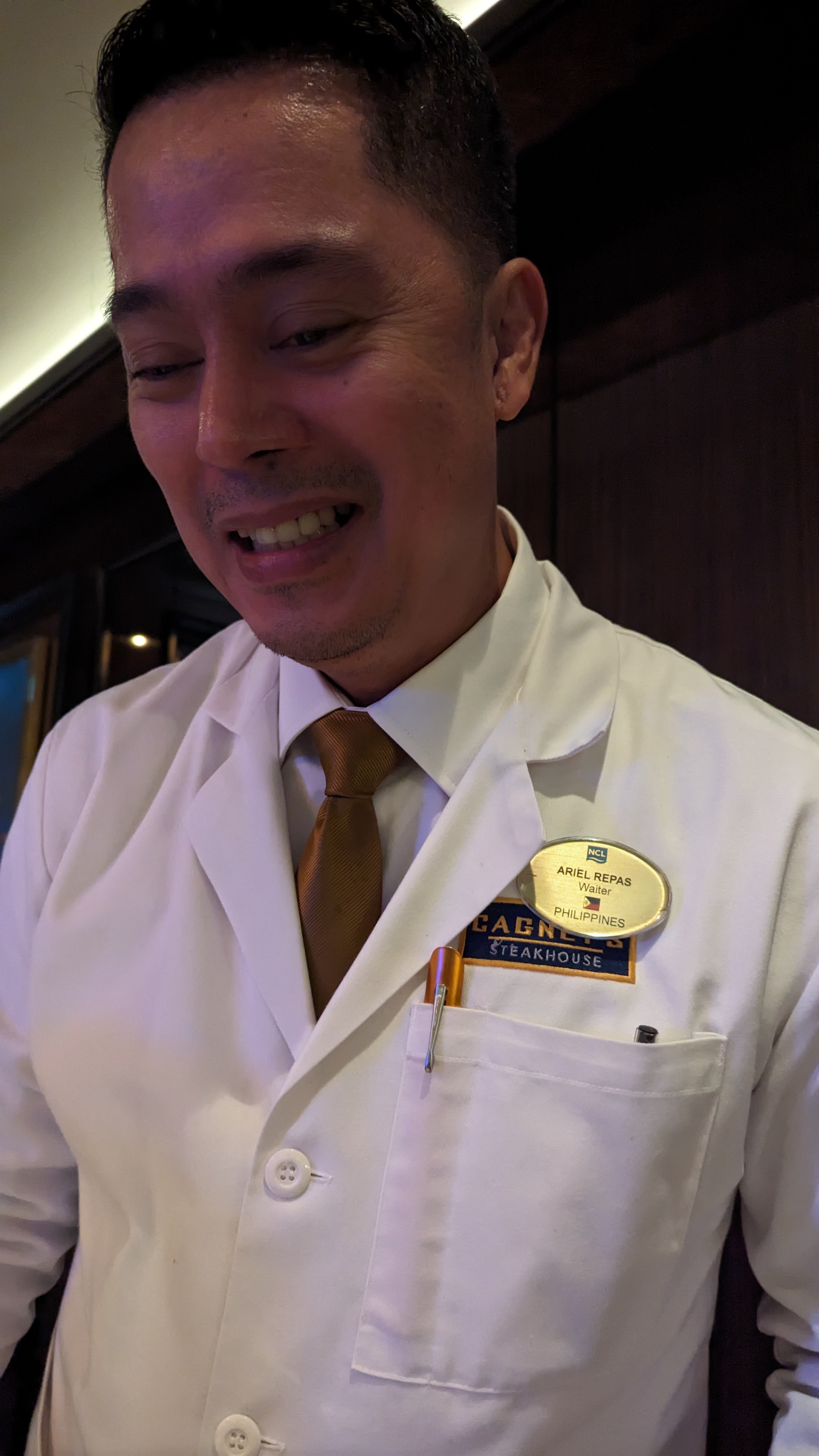 Our service team tonight was led by Ariel Ripas, who I remember seeing on Encore, though he never served us that I recall. He confirmed he was working aboard Encore a year ago, in Cagney’s along with Maye.